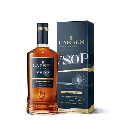 Koostisosad: Maitseomadused ja aroom Larsen VSOP värvus on särav merevaik. See on segu Fins Bois’i ja Petite Champagne eaux de vie’dest, mis on laagerdunud tammevaadis üle 4 aasta. Larsen VSOP aroomis on intensiivselt tunda kristalliseeritud puuvilju ja vürtse ning samuti õrnalt kuivatatud viigimarja, kaneeli ja vaniljet. Tammemaitse on hästi tasakaalustatud ja pika järelmaitsega. Serveerimissoovitus Larsen VSOP konjak sobib nautimiseks puhtalt toatemperatuuril või kokteilide koostisosana